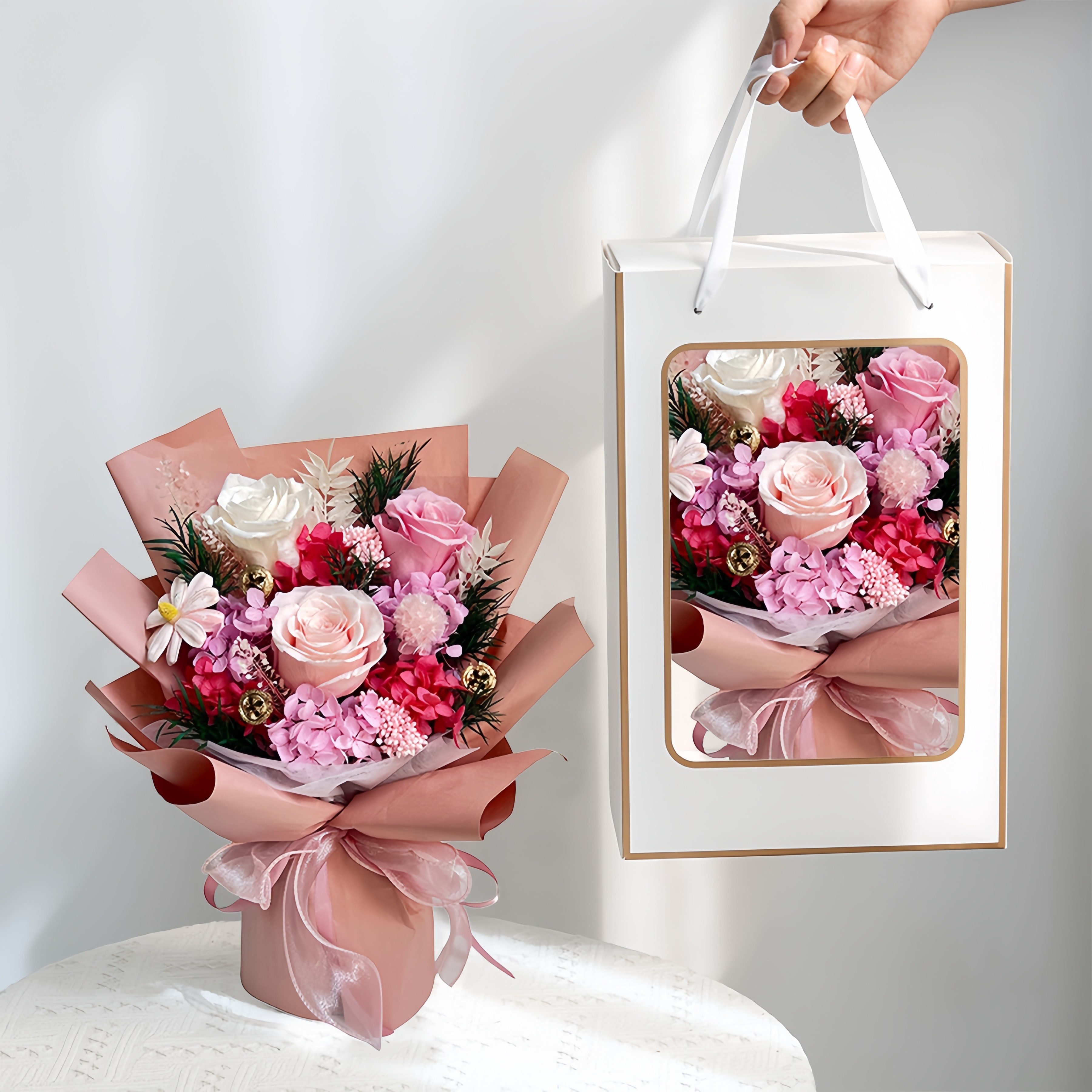 花材:玫瑰、绣球、小雏菊等永生配花(不含花瓶)