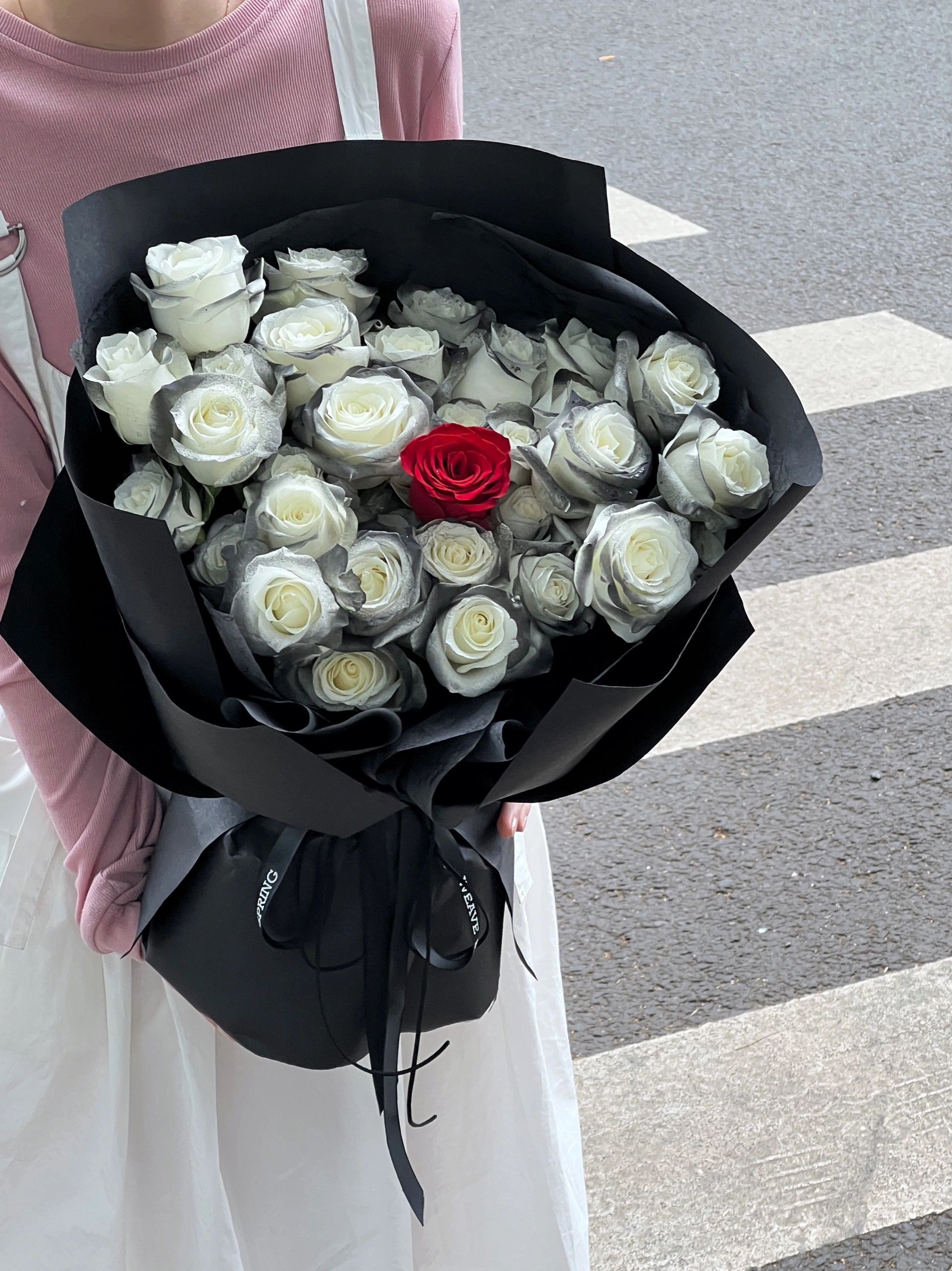 包装:采用黑色的包装纸,神秘而深邃,为整束花增添了一份神秘的色彩。黑色的包装纸象征着神秘和深沉,犹如爱情中的一抹不可预知的力量,散发着一种独特的魅力。